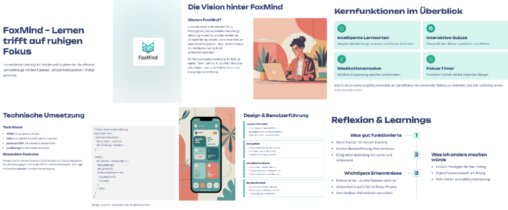 - Technische Umsetzung: z. B. HTML/CSS/JS, Prompts, Screenshots, Code-Snippets