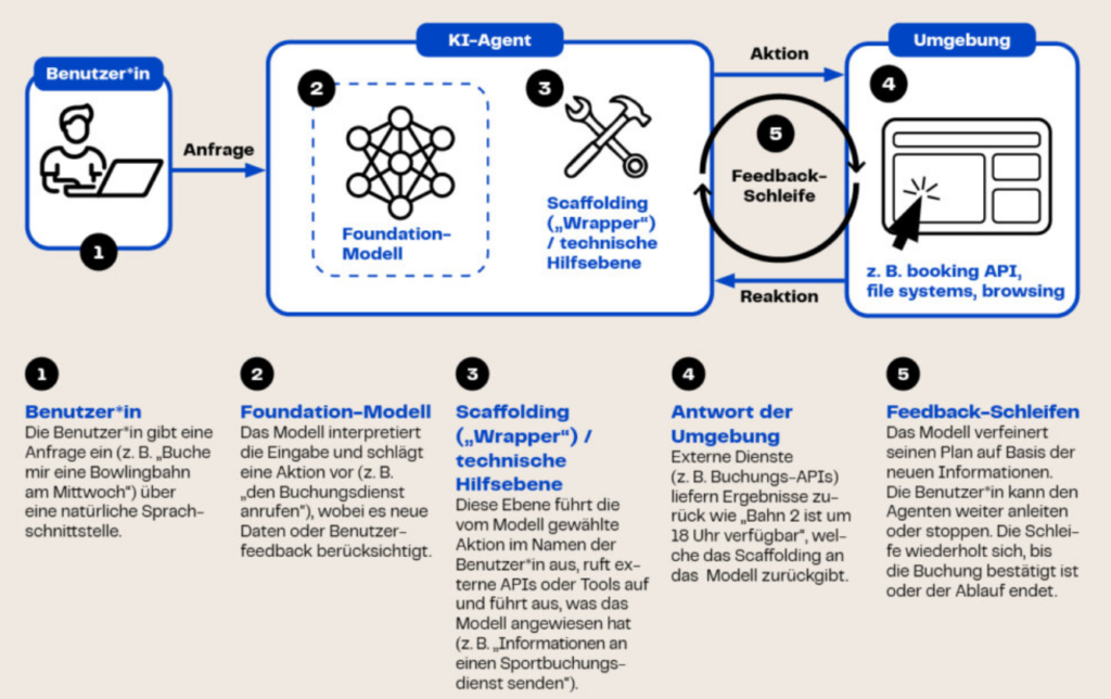 Der Agent führt konkrete Aktionen aus – z. B. Informationen abrufen, E-Mails versenden, Buchungen durchführen oder Systeme steuern. Beispiel: Ein KI-Agent bucht automatisch einen Arzttermin, nachdem er Symptome analysiert hat.