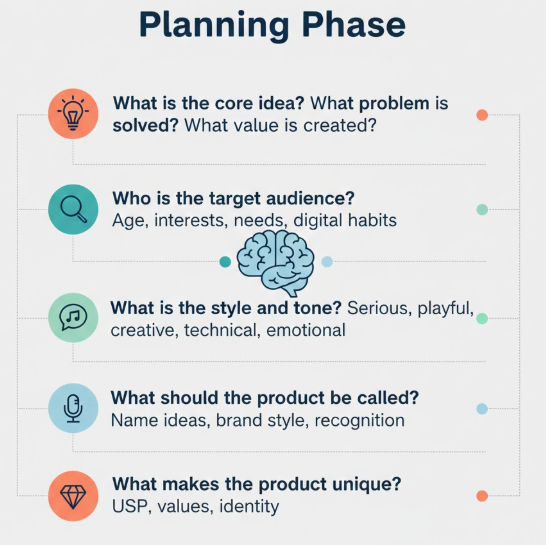 Die Planungsphase ist das Fundament jeder Produktgestaltung. Hier wird entschieden, was das Produkt leisten soll, für wen es gedacht ist und wie es sich von anderen abhebt. KI kann in dieser Phase als kreativer Impulsgeber, strategischer Berater und Strukturhilfe eingesetzt werden. Sie liefert Ideen, erkennt Muster und hilft dabei, Zielgruppen zu definieren, Markenstile zu entwickeln und Namensvorschläge zu generieren – schnell, vielfältig und datenbasiert.