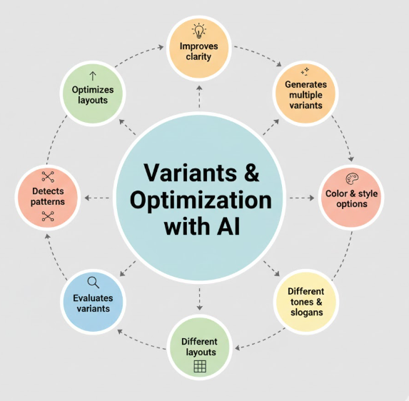 KI erstellt zahlreiche Design- und Textvarianten, erkennt Muster und schlägt Verbesserungen vor. So lassen sich Layouts testen, Inhalte vergleichen und Entscheidungen datenbasiert treffen. Die Optimierung erfolgt oft schneller und systematischer als bei manueller Gestaltung.