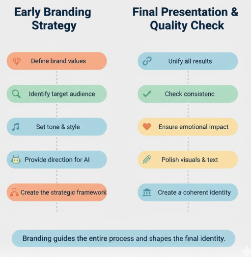 - Von Anfang an dabei (Strategie): Damit die KI dir passende Namen, Texte oder Designs liefern kann, musst du das Branding bereits zu Beginn (Schritt 1) definieren. Deine Markenwerte und die Zielgruppe dienen als „Rezept“ für die KI-Prompts. Ohne diesen frühen strategischen Rahmen würden die KI-Ergebnisse beliebig wirken.