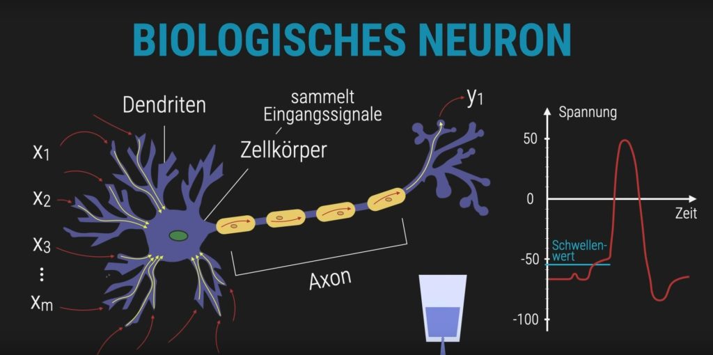 Ein biologisches Neuron ist eine spezialisierte Nervenzelle, die Informationen verarbeitet und weiterleitet. Es empfängt elektrische Signale über seine Verästelungen, die sogenannten Dendriten. Diese Signale werden im Zellkörper gesammelt und miteinander verrechnet. Wenn die Summe der eingehenden Signale einen bestimmten Schwellenwert überschreitet, erzeugt das Neuron ein Ausgangssignal – es „feuert“. Dieses Signal wird über das Axon weitergeleitet und kann andere Neuronen aktivieren. Auf diese Weise entstehen komplexe Informationsflüsse im Nervensystem, die z. B. Bewegungen, Wahrnehmung oder Entscheidungen steuern.