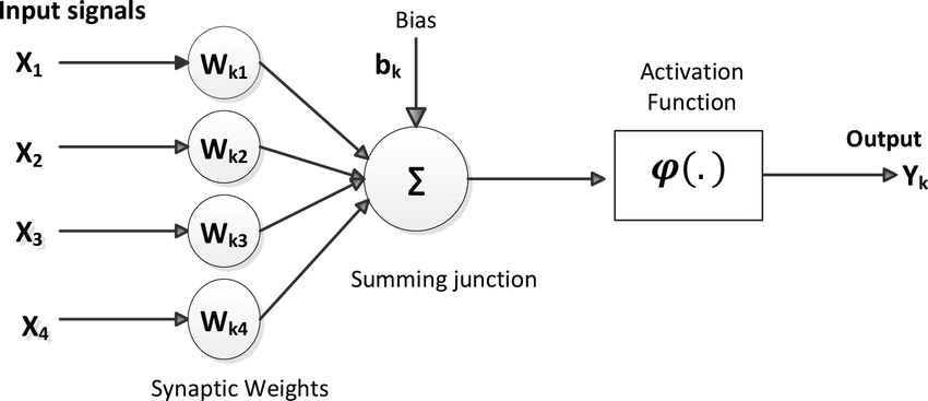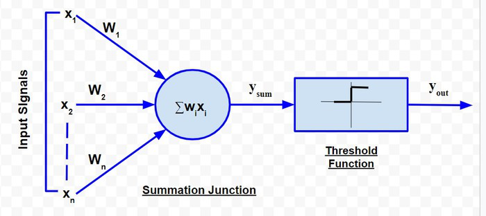 Dieses ursprüngliche Modell stellte ein Neuron als logisches Schwellwert-Element dar: Es empfängt mehrere Eingangssignale, summiert sie und gibt nur dann eine 1 aus –, wenn die Summe einen bestimmten Schwellenwert überschreitet. Andernfalls bleibt die Ausgabe 0.