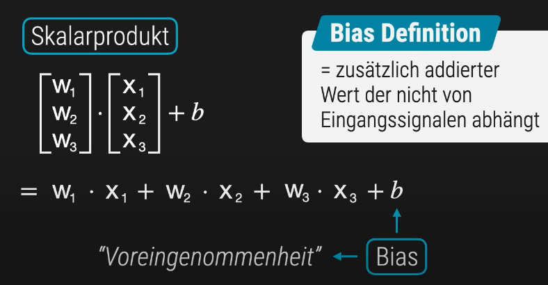 Der Bias ist ein fester Bestandteil der Perzeptron-Funktion und wird im Deutschen häufig als „Voreingenommenheit“ bezeichnet. Er stellt einen konstanten Wert dar, der zur gewichteten Summe der Eingabesignale addiert wird.
