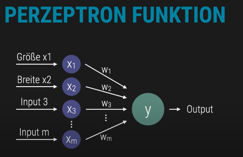 Die dargestellte Struktur zeigt, wie mehrere Eingabewerte über ihre jeweiligen Gewichtungen zu einem Gesamtwert verrechnet werden. Dieser Wert bildet die Grundlage für die Klassifikationsentscheidung des Perzeptrons.