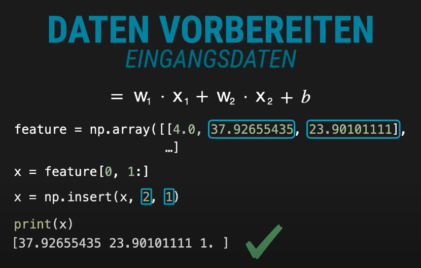 Um den Bias mathematisch konsistent in die Berechnung einzubinden, wird ein zusätzlicher Wert 1 an das Ende des Vektors eingefügt. Dies geschieht mit der Funktion np.insert(x, 2, 1). Der Bias wird anschließend als zusätzliches Gewicht behandelt, das mit diesem konstanten Eingang multipliziert wird.