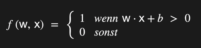 Die Kernfunktion des Perzeptrons lässt sich durch die Gleichung Y = w ⋅ x + b beschreiben. Dabei stehen die Gewichte (w) für die Stärke der Verbindungen, die Eingangssignale (x) für die Features und der Bias (b) für eine Verschiebung des Entscheidungswertes. Diese Berechnung ist eine elementare Operation in neuronalen Netzen und bildet die Grundlage für die Klassifikationsentscheidung.