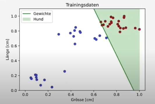 Zur Anwendung: Neue Daten holen, z. B. x_neu, und dann einfach perceptron.perzeptron(x_neu) ausführen. Das Modell klassifiziert automatisch – in unserem Beispiel ist das Tier mit 24,5 cm Länge und 13,8 cm Breite kein Hund.